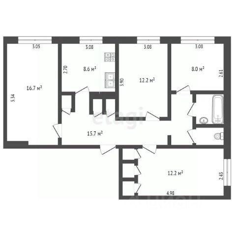 Планировка продумана для комфортного проживания: просторная прихожая (14,1 кв.м) ведет в изолированные комнаты площадью 18,9 кв.м, 12,4 кв.м, 8,2 кв.м и 8,1 кв.м, что позволяет удобно зонировать пространство для семьи или работы. Кухня 8,7 кв.м оборудована практичной напольной плиткой, а раздельный санузел добавляет удобства.