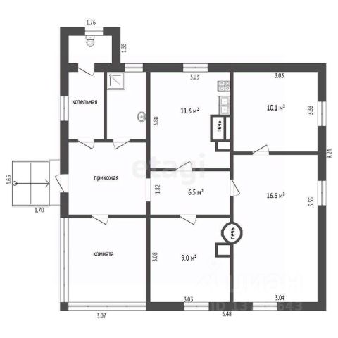Дом достаточного размера для проживания семьи. В доме 2 комнаты - 21 м2 и 11.5 м2, разделены перегородкой. Отапливаются печью-"стояком", расположенным между комнатами.
