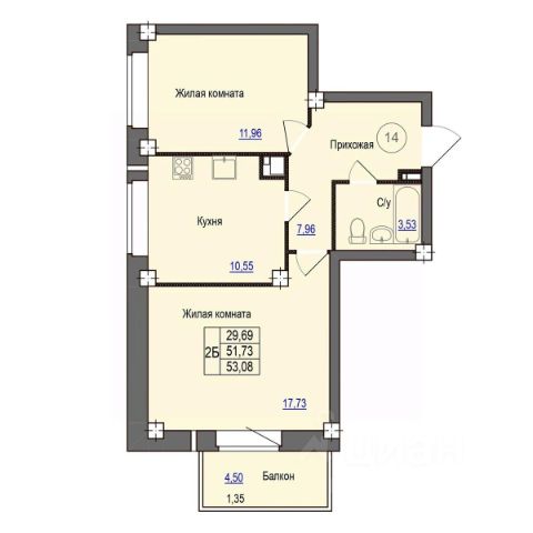 В монолитно-кирпичном доме 14 расположено 112 квартир с улучшенными планировками. Площадь однокомнатных квартир от 49 кв.м., двухкомнатных - от 68 кв.м., трехкомнатных - от 93 кв.м.