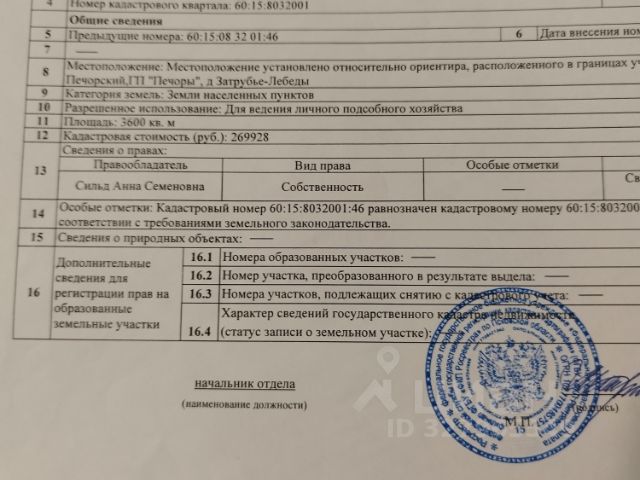 Кадастровый номер 60:03:091105:01:29-А Частная собственность. Жилой дом (бревенчатый) постройки 1968 года. Расположенный по адресу: Псковская область, Гдовский район, д. Чудская Рудница, Самолвовской волости. Строительный объём 136 куб.м; Общая площадь дома 43,2 кв.м, жилые помещения 38,0 кв.м; Спальных мест в доме 4, в чулане 2 и в веранде 1. Земельный участок у дома 1200 кв. м Второй участок площадью 300 кв. м (находится в метрах 50) Отопление печное. Санузел во дворе дома (простой). Электричество во всех помещениях, какие есть на участке, есть дрова (2 трактора). Газ балонный (балоны в наличии). Водоснабжение из колодца подают насосы в дом. О доме: брёвна очень толстые, крепкие, обшит вагонкой (красится). Потолки во всем доме обшитым вагонкой, полы деревянный, двойные рамы деревянные. Подвал оборудован внутри блоками и кирпичем, есть полки и столы для хранения продуктов. Фундамент из цемента, плита, печка, крышка покрыта шифером, есть чулан, веранда, двор, сараи. На участке новая современная баня из бруса, новая летняя кухня, а в ней плита (можно варить, сушить, воду греть (горшки, ванны - все есть). Новая бытовка для отдыха и хранения овощей и фруктов до холодов до мороза. Есть колодец с хорошей питьевой водой (железобетонные кольца) В саду почти все виды плодово-ягодных деревьев и кустарников по Псковской обл. (Яблони, слива, вишня, смородина белая, красная, чёрная, ежевика, крыжовник, малина) Есть сараи, но они возрастные. Очень хорошие участки земли, новая теплица из поликарбоната. Заборы на железных столбах, обтянутые железной сеткой и щитами. Все, что в доме внутри можно договориться, все останется. Дом жилой, пожалуйста, приезжайте и можно сразу жить. В нашем уголке очень много клюквы, брусники, черники, голубики, малины и даже ежевики, морошки, рыба в нашем Чудском озере: ёрш водится, щука, лещ, судак, сиг, плотва, окунь, снеток, налим, редко карп, угри, главное было бы желание. А сколько у нас грибов с июня по октябрь. Кого заинтересовало, звоните, будем рады, расскажем, покажем по телефону.