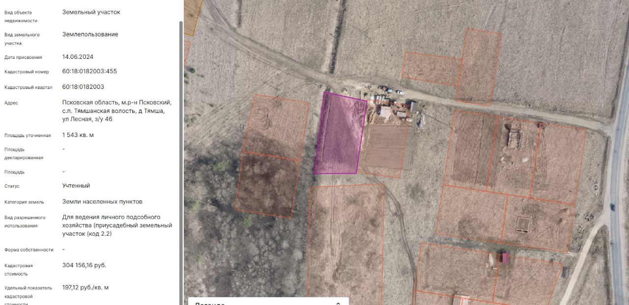 Земельный участок с КН60:18:0182003:455, площадью 1543 кв.м, с местоположением: Псковская область, Псковский муниципальный округ, д. Тямша, ул. Лесная, з/у 46, с видом разрешенного использования "для ведения личного подсобного хозяйства (приусадебный земельный участок)"