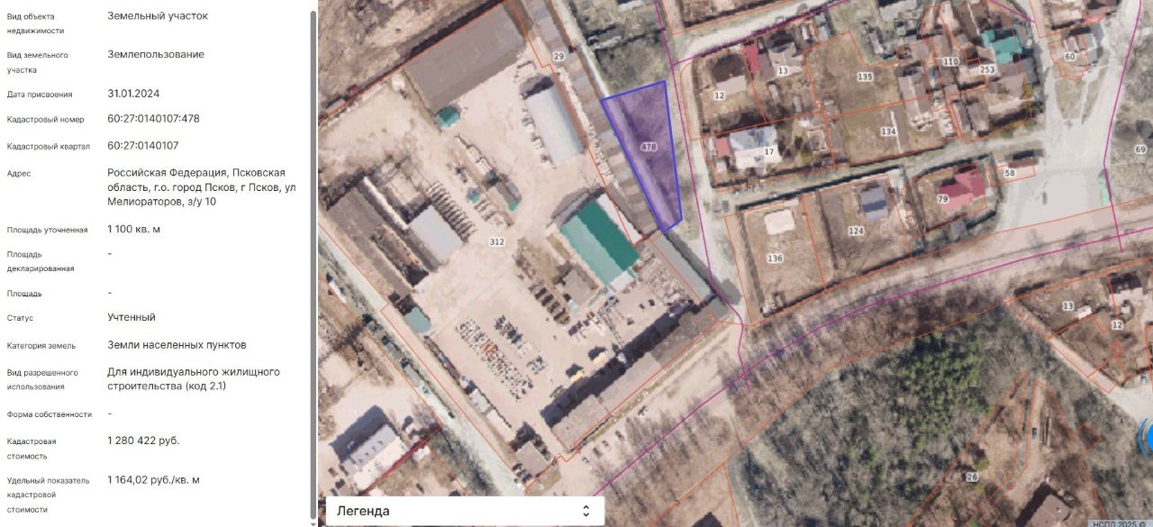 Земельный участок с КН 60:27:0140107:478, площадью 1100 кв.м, с местоположением: Псковская область, г. Псков, ул. Мелиораторов, з/у 10, с видом разрешенного использования "для индивидуального жилищного строительства"