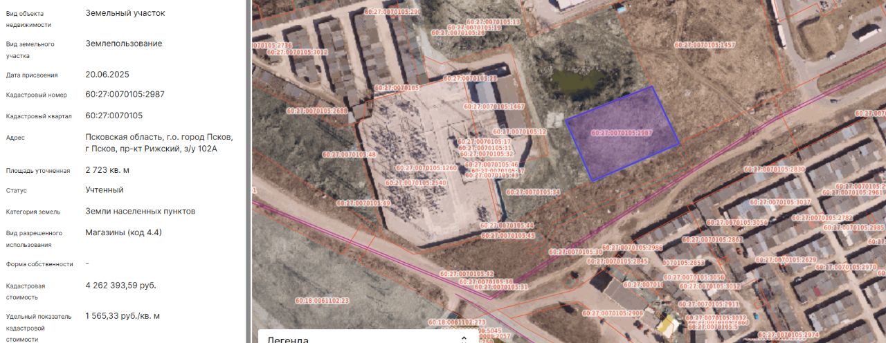 Земельный участок с КН 60:27:0070105:2987, площадью 2723 кв.м, с местоположением: Псковская область, г. Псков, пр-кт Рижский, з/у 102А, с видом разрешенного использования "магазины" (код 4.4)