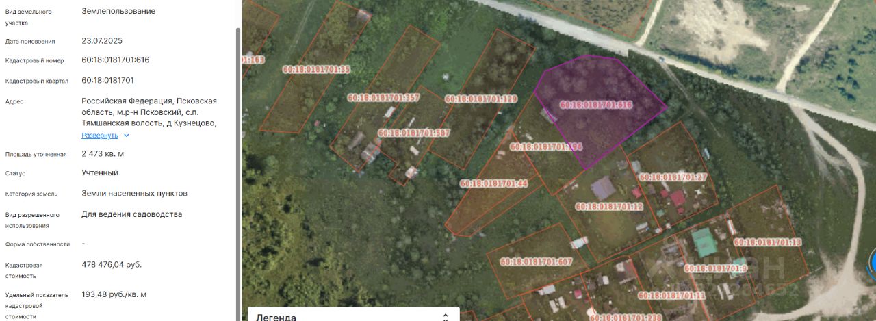 Данные получены с сайта ГИС Торги. Земельный участок с КН 60:18:0181701:616, площадью 2473 кв.м, с местоположением: Псковская область, Псковский муниципальный округ, д. Кузнецово, ул. Солнечная, з/у 1, с видом разрешенного использования "ведение садоводства"