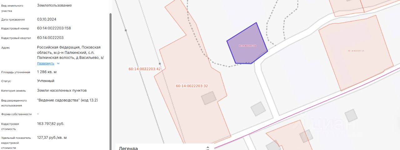 Земельный участок с КН 60:14:0022203:158, площадью 1286 кв.м, с местоположением: Псковская область, Палкинский муниципальный округ, д. Васильево, з/у 32А, с видом разрешенного использования "ведение садоводства"