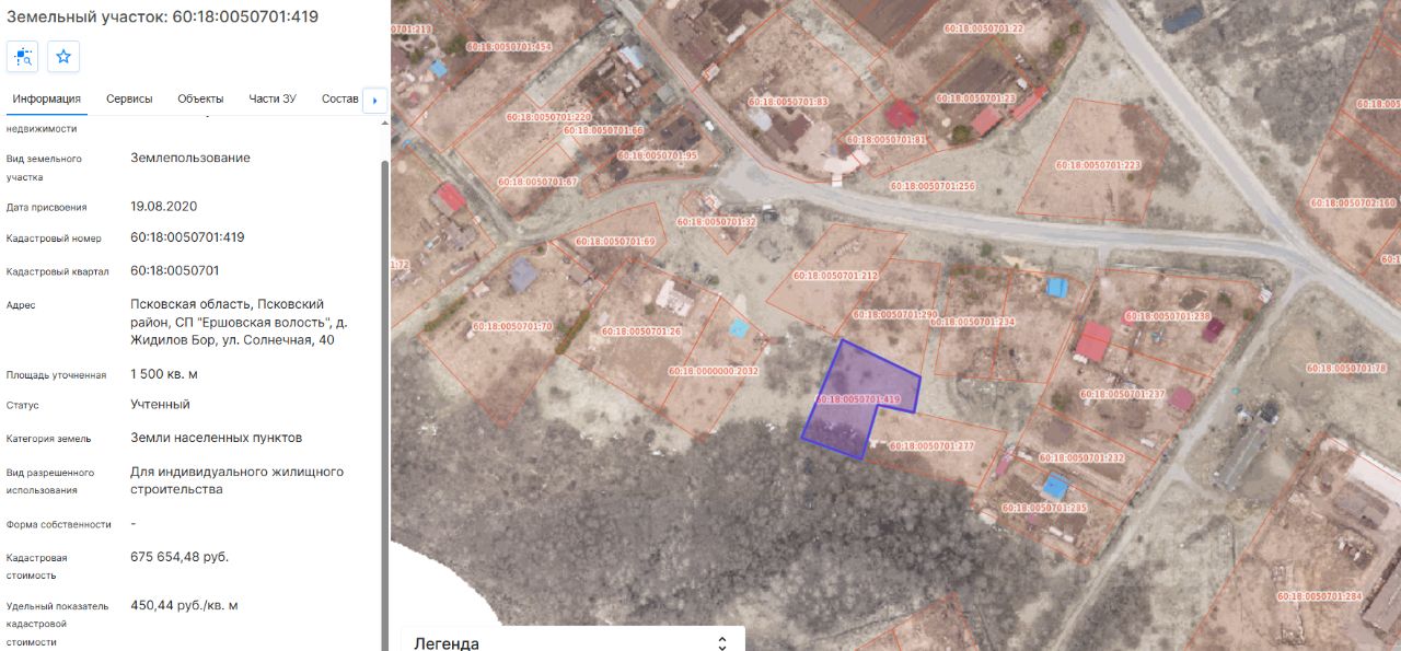 Земельный участок с КН 60:18:0050701:419, площадью 1500 кв.м, с местоположением: Псковская область, Псковский муниципальный округ, д. Жидилов Бор, ул. Солнечная, 40, с видом разрешенного использования "для индивидуального жилищного строительства"