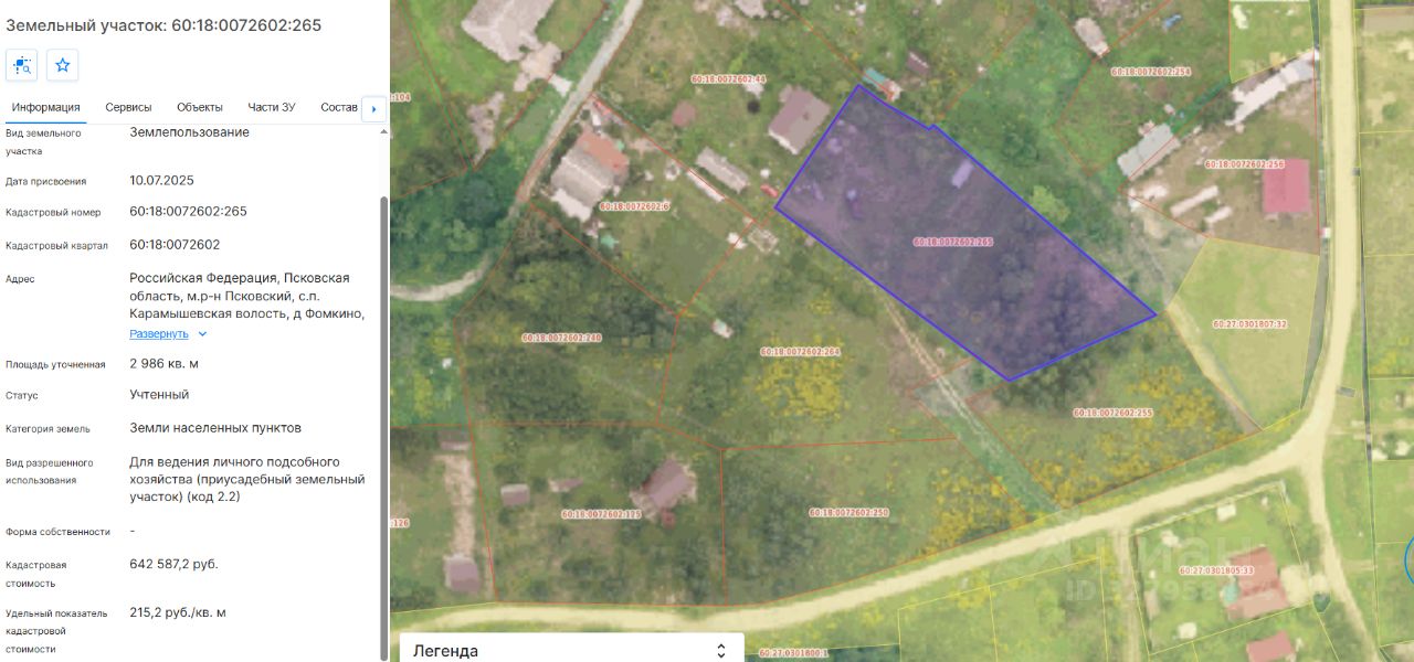 Земельный участок с КН 60:18:0072602:265, площадью 2986 кв.м, с местоположением: Псковская область, Псковский муниципальный округ, д. Фомкино, ул. Народная, з/у 10А, с видом разрешенного использования "для ведения личного подсобного хозяйства (приусадебный земельный участок)"