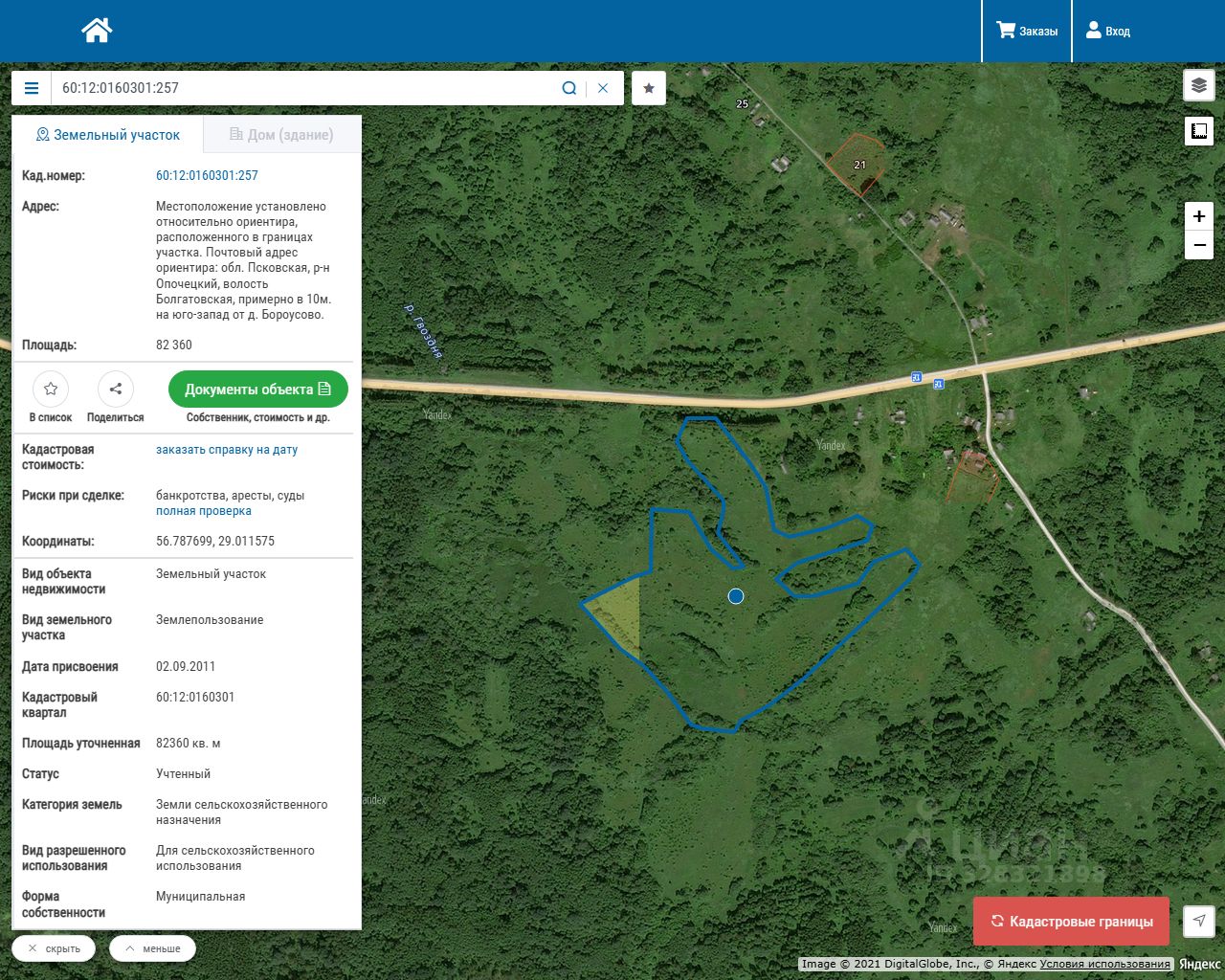 Земельный участок, местоположением: Псковская область, Опочецкий район, Болгатовская волость, примерно в 10 м. на юго-запад от д. Бороусово, площадью 82360 кв.м., с кадастровым номером 60:12:0160301:257, разрешенное использование земельного участка для сельскохозяйственного использования.
