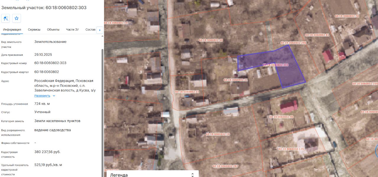 Земельный участок с КН 60:18:0060802:303, площадью 724 кв.м, с местоположением: Псковская область, Псковский муниципальный округ, д. Кусва, з/у 57Б, с основным видом разрешенного использования "ведение садоводства"