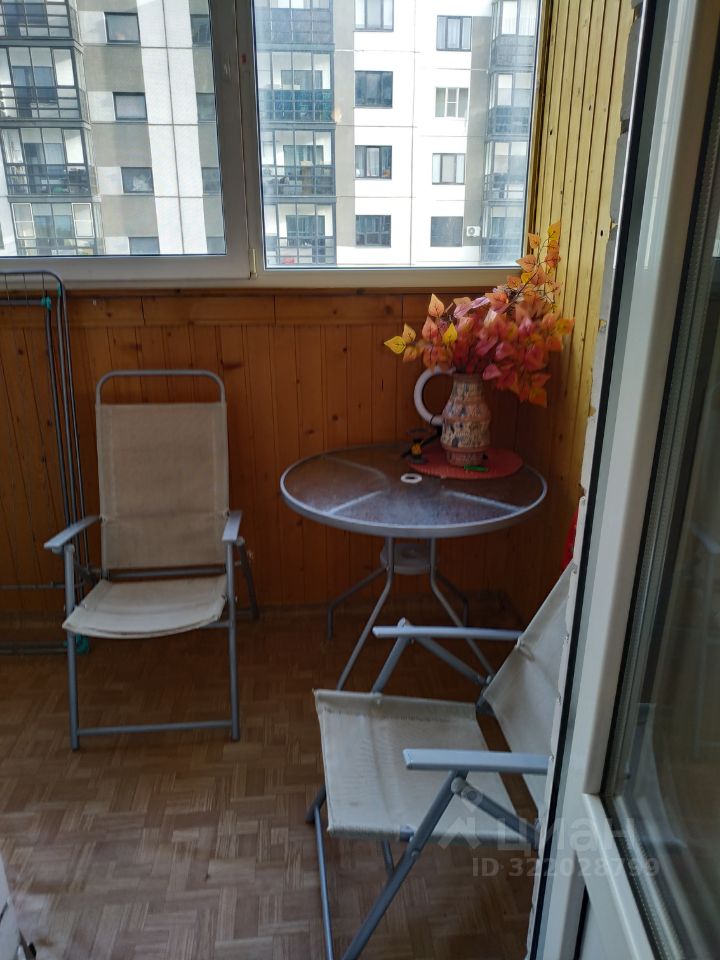 В комнате мягкий диван / раскладывается / кресло, стенка. На лоджии круглый столик, два кресла. / лоджия застеклена./ В кухонной зоне расположен стол, две табуретки; зона моечная, и для приготовления пищи-  варочная электрическая панель.