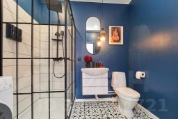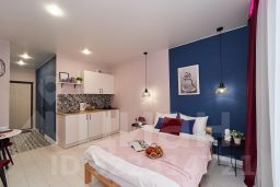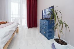 В квартире новый дизайнерский ремонт. Есть кровать, шкаф, комод, смарт-ТВ, зона кухни с холодильником, чайником, необходимой посудой и набором продуктов, микроволновая печь. Умная колонка работает в ритме дома и составляет высокотехнологичное трио с телевизором и подсветкой в помещении. В санузле располагается душевая кабина с тропическим душем, набор полотенец, фен, утюг, средства гигиены, стиральная машина. На балконе - зона релаксации: кресла и журнальный столик.