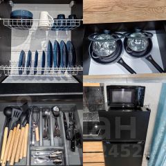 Полностью укомплектованная кухня: посуда, кухонные приборы, холодильник, варочная панель,микроволновка, чайник