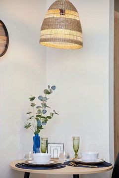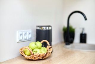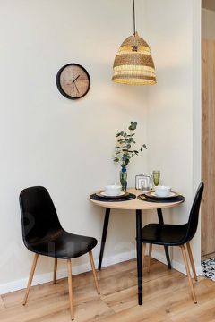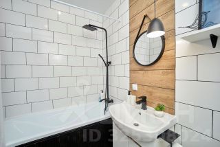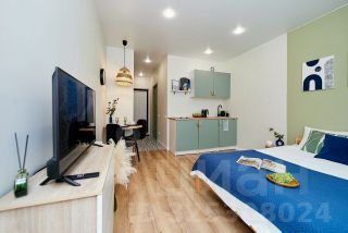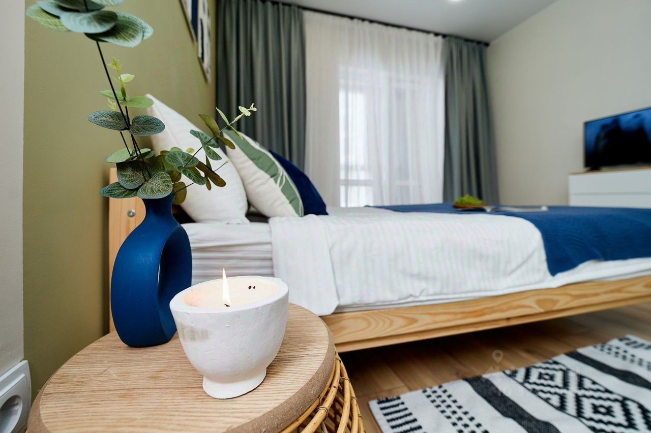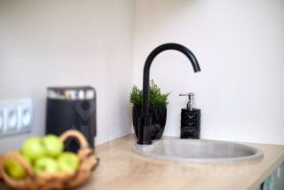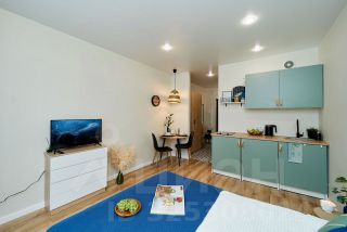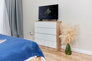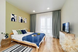 В квартире дизайнерский ремонт. Есть кровать, шкаф, комод, смарт-ТВ, зона кухни с холодильником, чайником, необходимой посудой и набором продуктов, чтобы при приезде не бежать в магазин.