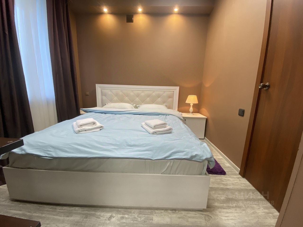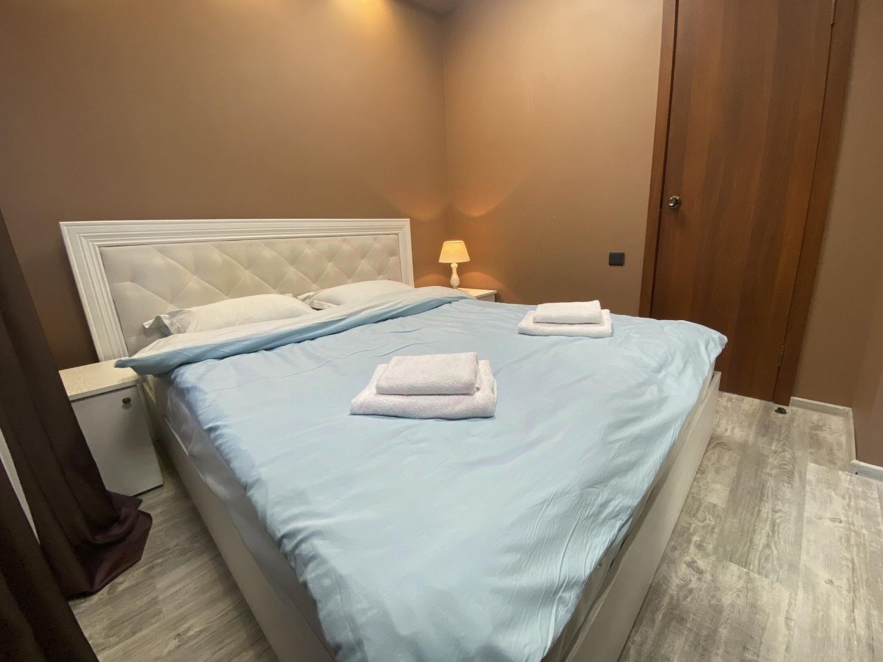 Апартаменты на первом этаже с отдельным входом. В апартаментах есть оборудованная кухня, обеденная зова, двуспальная кровать, два раскладных диван, собственная ванная комната с душем.