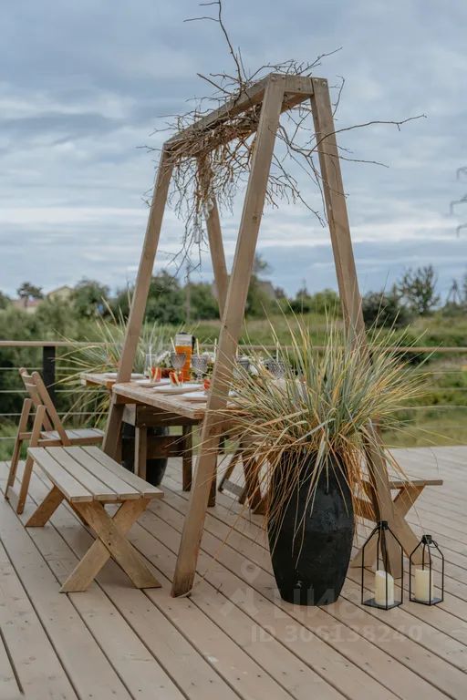 Уютное пространство с панорамными окнами, открытой террасой с креслами и столиком для чаепития.