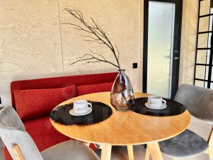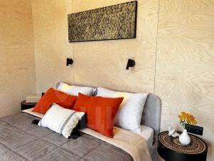 В домике двухспальная кровать и раскладывающийся диван