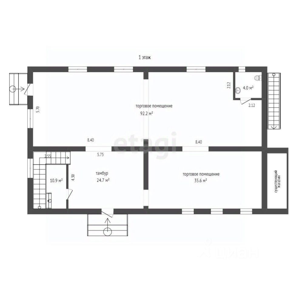 Площадь первого этажа - 167,4 м.кв., занимает магазин "Красное и Белое".