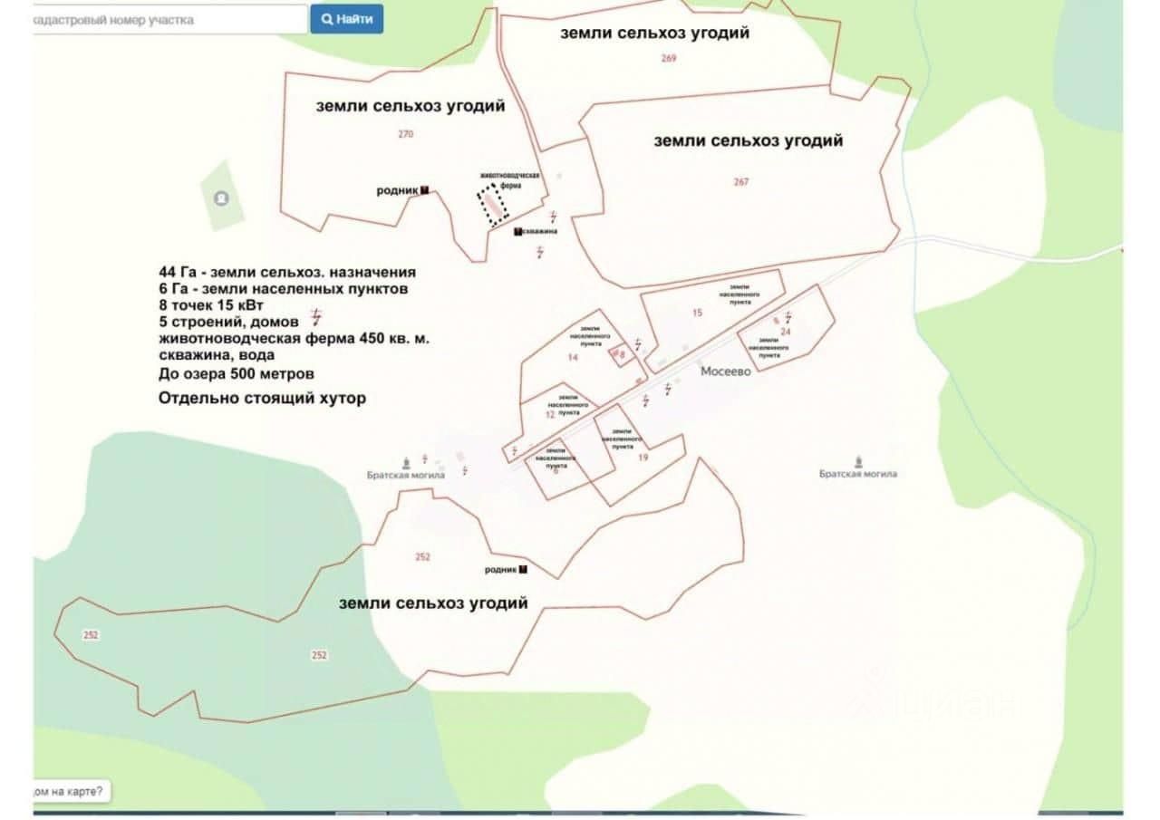 Продается участок 50 га, расположен в Новоржевском районе, Выборгская волость, д. Мосеево. Вся площадь состоит из нескольких участков, из них 6 га - земли населенных пунктов. На участках расположены жилые дома, животноводческая ферма 450 кв. м. Скважина с водой. На каждом участке электричество 15 Квт. До ближайшего населенного пункти 1, 5 км. До п. Пушкинские Горы 29 км. Спокойное живописное место, охота, рыбалка, грибы, ягоды. В 500 м озеро Воробьевское. Кадастровые номера участков: 60:10:0040201:6, 8, 12, 14, 15, 19, 2460:10:0040201:31, 32, 3360:10:0100701:28, 3160:10:0130103:267, 269, 270 60:10:0000000:25260:10:0130103:268 ферма. Документы готовы! Рассмотрим любые варианты оплаты. Звоните!!!