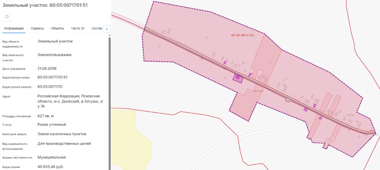 нежилое здание (бывший магазин) с кадастровым номером 60:05:0071701:206, площадью 94,8 кв.м, расположенное по адресу: Псковская область, Дновский муниципальный округ, д. Загузье, д.7А; количество этажей 1, в том числе подземных 0, материал наружных стен кирпичные, год завершения строительства 1978. - земельный участок из земель населенных пунктов, с кадастровым номером 60:05:0071701:51, площадью 627 кв.м, с видом разрешенного использования: для производственных целей, расположенный по адресу: Псковская область, Дновский муниципальный округ, д. Загузье