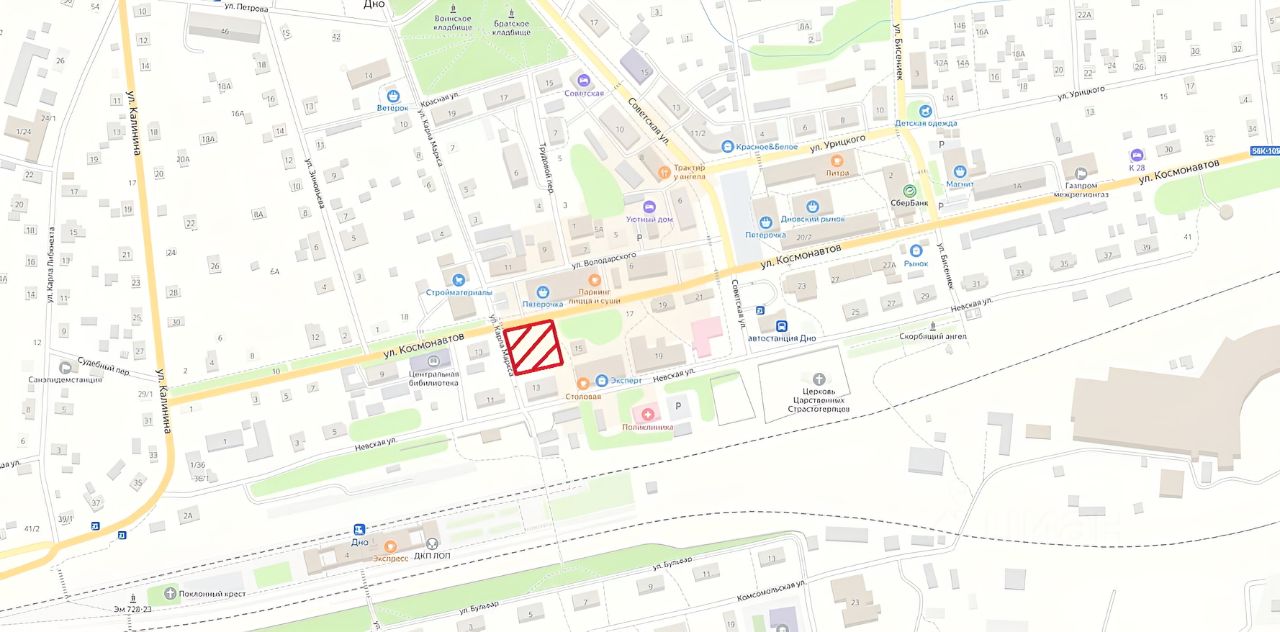 Продаётся земельный участок площадью 12.14 соток в центре города Дно на ул. Космонавтов д.15 под строительство торгового здания.
