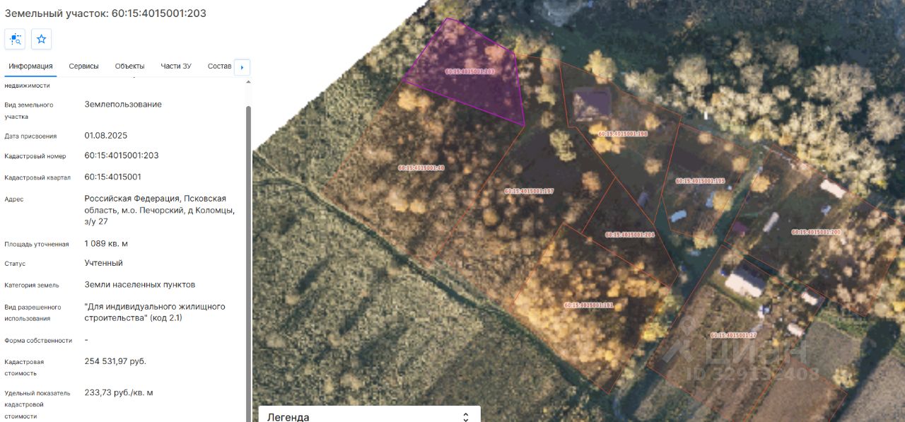 Земельный участок с КН 60:15:4015001:203, площадью 1089 кв.м, с местоположением: Псковская область, Печорский муниципальный округ, д. Коломцы, з/у 27, с видом разрешенного использования "для индивидуального жилищного строительства"