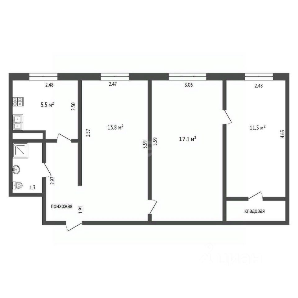 Общая площадь: 56 кв. м. С/у совмещённый.