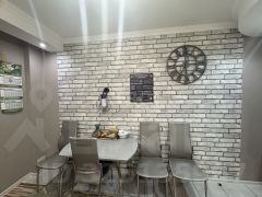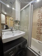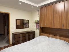 В помещении выполнен аккуратный косметический ремонт нейтральных тонов, готовый к заселению. Часть практичной мебели, включая встроенную кухню, шкаф-купе в прихожей и спальный гарнитур, остается новым владельцам.