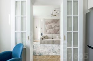 Общая площадь квартиры 80 кв.м, из которых кухня+гостиная 29 кв.м, комнаты по 15 и 17 кв.м. Потолки высотой 3 метра, что добавляет визуального объема.