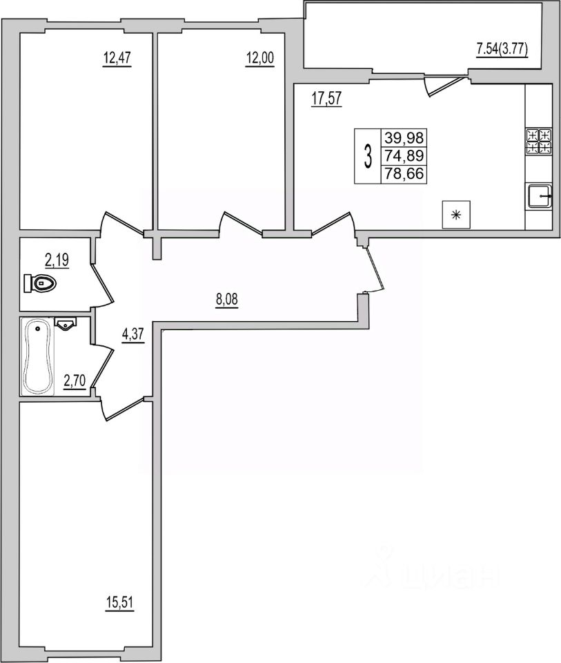 Продаётся 3-комнатная квартира в строящемся доме (Дом 1), срок сдачи: IV-кв. 2026, общей площадью 78.66 кв.м., на 7 этаже. Новый жилой комплекс "Семь сезонов" от застройщика "ЛУГ"