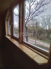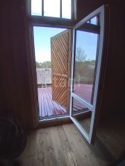 Окна коробка деревянная, сделана по старинной конструкции с круглой подушкой подоконник, рамы пластиковые - двойное остекление.