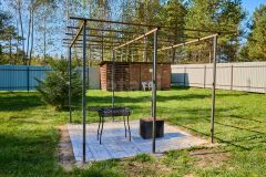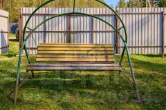 Огорожен забором. Новая современная теплица для выращивания овощей, летняя кухня, зона отдыха с мангалом, уютная терраса. Качели, газон, ровный и ухоженный участок.