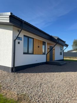 Строительство дома из газоблока, крыша скатная (снегозадержатели), плитный фундамент (монолитная плита) общей площадью 117.1 кв. метров.